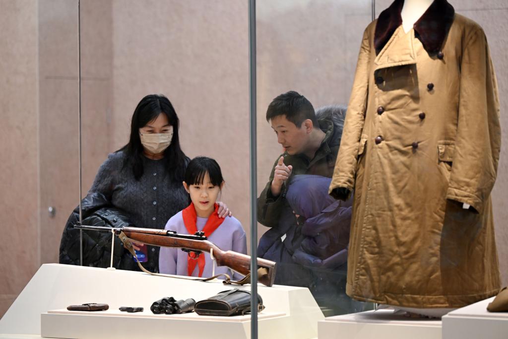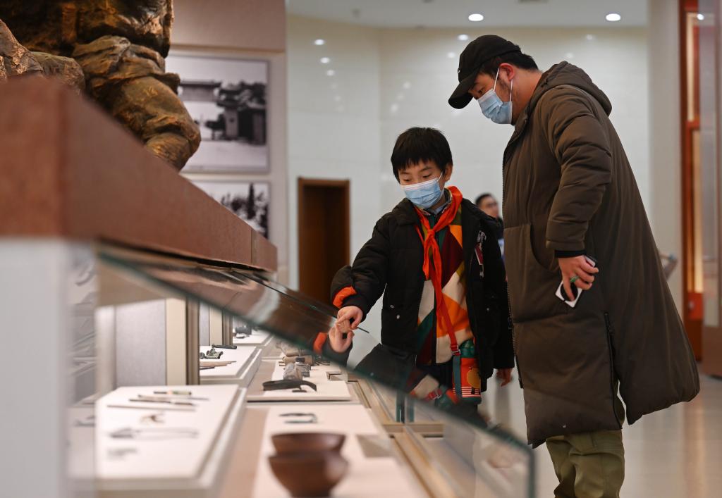 2024年1月28日,家长带着孩子在平津战役纪念馆内参观。