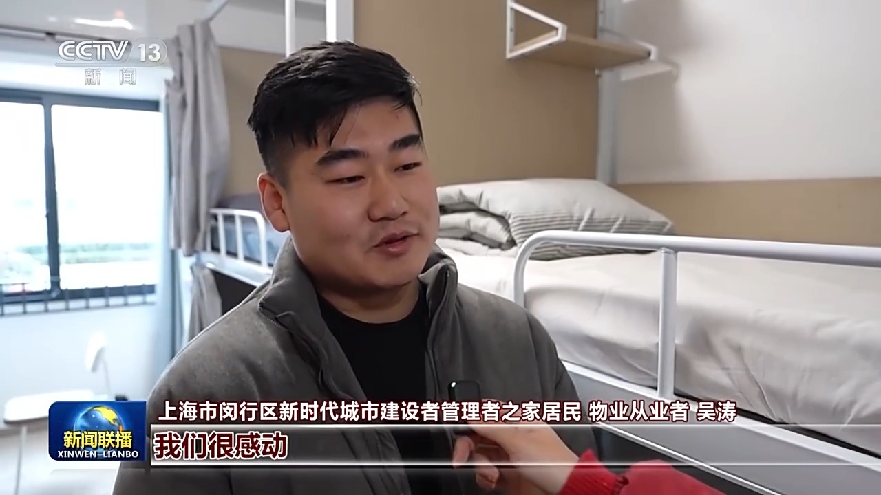 上海市闵行区新时代城市建设者管理者之家居民、物业从业者 吴涛:总书记到我们这里来关心我们的生活,我们很感动。我是去年搬过来的,然后比之前近多了,这边给我们提供了设施也非常全面,非常方便。