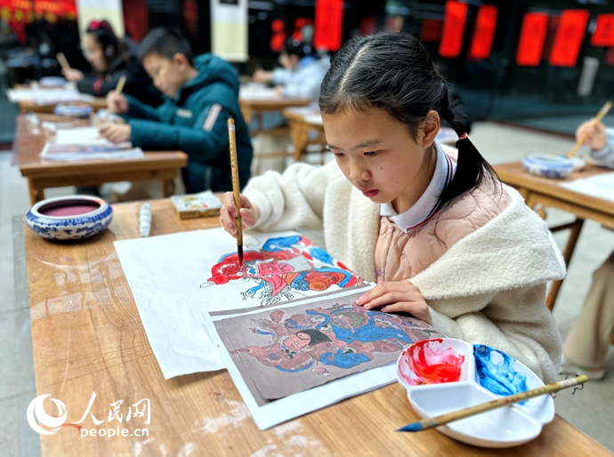 在孔子博物馆过大年“黄河文化大集”上,小学生正在为孔府门神上色。 人民网 乔姝摄