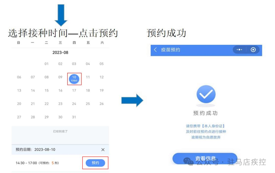 预约接种地点为驻马店市金山社区卫生服务中心、驻马店市关王庙卫生院。