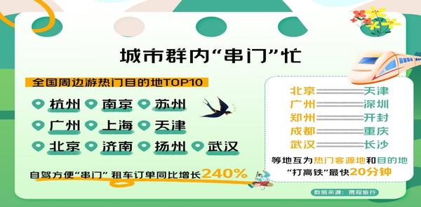 短途游成为许多人的假期首选。携程发现,郑州=开封,济南=青岛,杭州=上海,北京=天津,广州=深圳,成都=重庆,武汉=长沙等地互为假期热门客源地和目的地,“打高铁”最快仅需20分钟就能完成城市群内的“串门”,让这些城市的旅客能够在小长假享受双城生活的快乐。