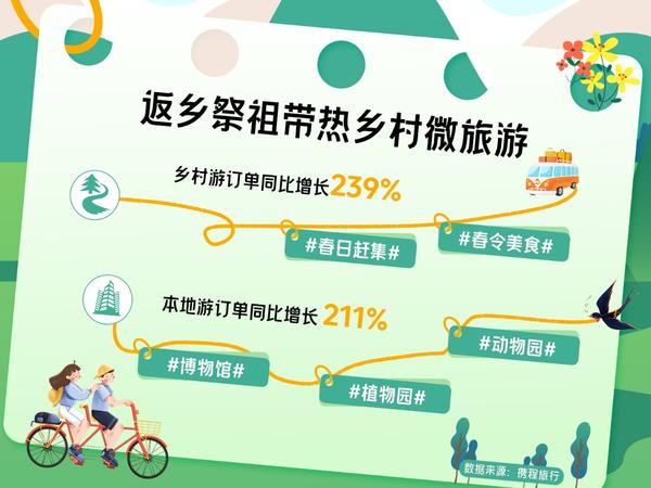 与citywalk相比,更闲适的countrywalk吸引了许多人的目光,乡村成为大众自我疗愈、逃离喧嚣的心头好。清明节假期期间,国内乡村游订单同比增长239%。踏青徒步、赏春花美景、赶上一场春日市集,尝尝村里的时令春日美食,countrywalk让清明短途游有了更多选择。以自营的携程度假农庄住宿和旅游接待为例,乡村旅游人次总量同比增长超230%,游客可以在这里进行采摘、围炉煮茶、非遗手工制作等等,深度体验当地的文化。
