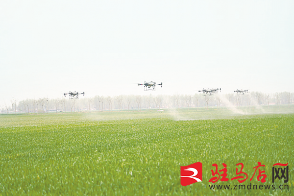 “装药、起飞、定位、喷洒……”4月10日,正阳县2024年小麦重大病虫害统防统治暨“一喷三防”现场会在熊寨镇王大塘村举行。启动仪式现场,10多架植保无人机在麦田上空开展“一喷三防”作业。