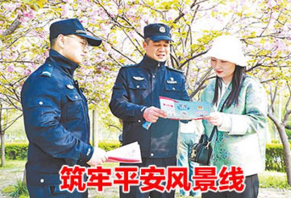 近日,汝南县天中山文化园牡丹盛开,该县公安局民警在执勤过程中为游客提供道路指引、赏花攻略等服务,并积极宣传反诈知识,提醒游客在游玩时谨防诈骗,受到游客交口称赞。(通讯员 王航天)