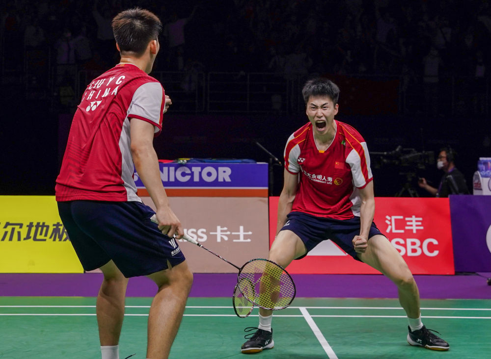 2023年5月20日,中国队组合刘雨辰/欧烜屹(右)在2023年苏迪曼杯世界羽毛球混合团体锦标赛半决赛男双比赛后庆祝。新华社记者 李博 摄