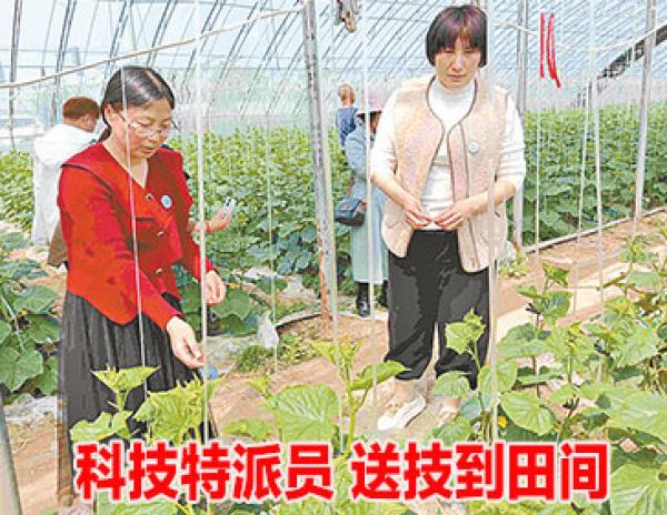 近日,省级科技特派员姜银霞、市级科技特派员王春丽走进上蔡县黄埠镇南王楼村蔬菜种植基地,对大棚内的黄瓜生长和结果情况进行查看,对种植户提出的问题进行解答。近年来,科技特派员通过科技助力乡村产业振兴行动,推动乡村产业发展壮大,让产业增值、农户受益,用科技力量助力乡村振兴。(记者 刘永奇 通讯员 周金高)