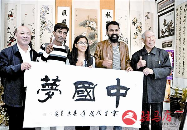 4月23日上午,来自巴基斯坦的阿里、阿沙和来自尼泊尔的榛榛在黄淮学院国际学院老师白海峰的带领下,来到天中书画研究院感受中国书画的魅力。