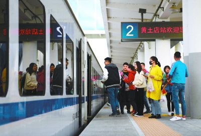 从黄土店站开往密云古北口站的怀密线列车4月30日开通,前来体验的市民游客兴高采烈登上列车。本报记者 和冠欣 摄