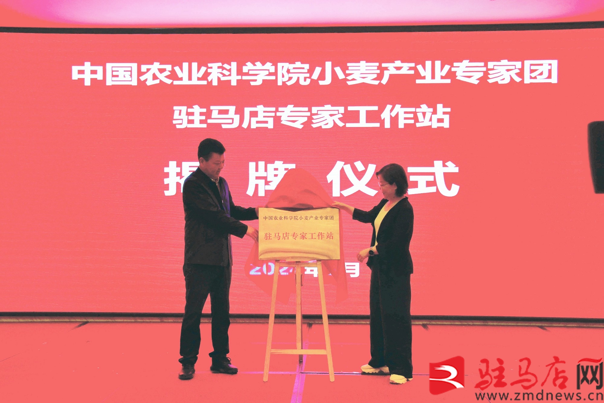 中国农科院成果转化局副局长王宇鸿、驻马店市农科院党组书记江海松为中国农业科学院小麦产业专家团驻马店专家工作站揭牌。