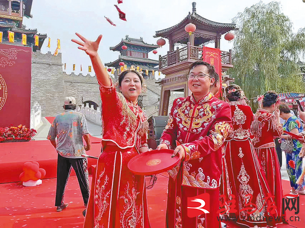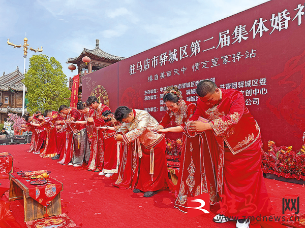 “共牵红巾、共入华堂、礼谢众宾、礼赞官传古训、行执手之礼……”5月20日,由驿城区委宣传部主办,驿城区文明办、驿城区总工会、共青团驿城区委、驿城区妇联、驿城区民政局、驿城区文创中心承办,香山街道、皇家驿站、龙族婚庆公司协办的驿城区第二届集体婚礼在皇家驿站举行,8对新人身穿传统婚礼服饰,在亲朋好友和现场观众的见证下,携手走进婚姻殿堂。