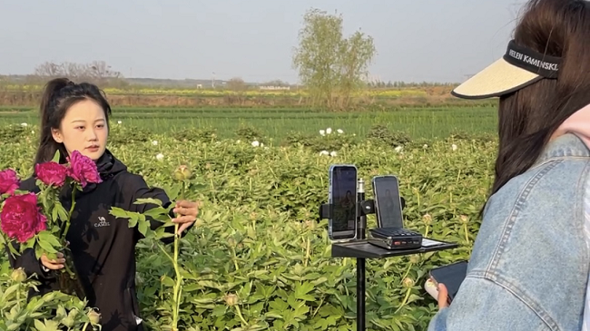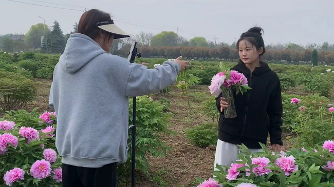 “各位姐妹,我们线下花卉基地有700多亩,有牡丹,也有芍药,姐妹们感兴趣的话可以来线下基地选购,或者来基地花海打卡拍照都是没有问题的……”一大早,直播声便回荡在洛阳市孟津区千卉谷鲜切花种植基地的田间地头,正在田间地头进行直播带货的是洛阳职业技术学院电商物流学院9名学生组成的助农直播团队。