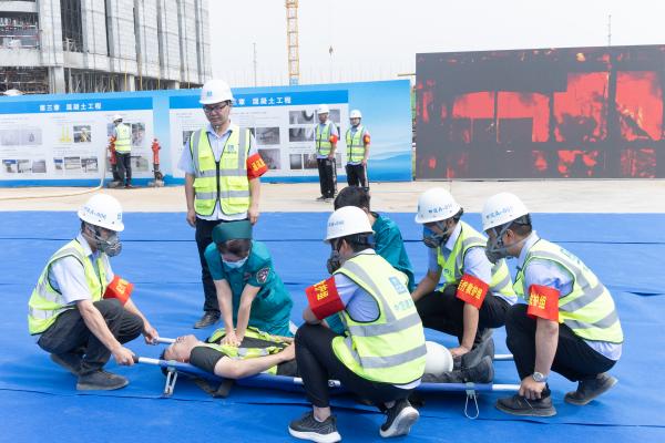 观摩会上,演练模拟火灾和汛情发生后,安全员第一时间赶赴现场查看情况,并立即报告项目部救援行动小组总指挥,同时启动事故应急救援预案。警戒组、医疗救护组和后勤保障组迅速就位,有序展开警戒疏散、技术排险、现场抢险、医疗救护等各项救援工作。