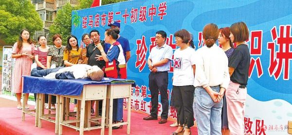 本报讯 6月21日,为进一步帮助广大师生增强防溺水安全意识,掌握防溺水知识技能,提高自救互救能力,市红十字会应急救护讲师吴春华和市红十字蛟龙水上义务搜救队队员一起,走进驻马店市第十二初级中学、驻马店第二高级中学、驻马店市第十小学和驻马店市第二十初级中学,为学生们宣讲防溺水安全知识(如图)。