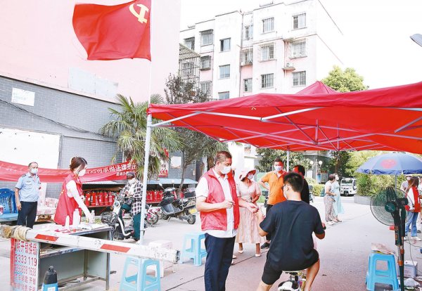 党员志愿者下沉“双报到”联系社区,开展疫情防控志愿服务活动。