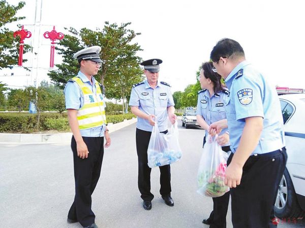 7月21日、22日,吴小丽连续两天来到大气污染防治卡点,与执勤民警一同在烈日下执勤,并询问每位民警的身心状态,为每个卡点、每辆巡逻车送上水果和饮品(如图)。