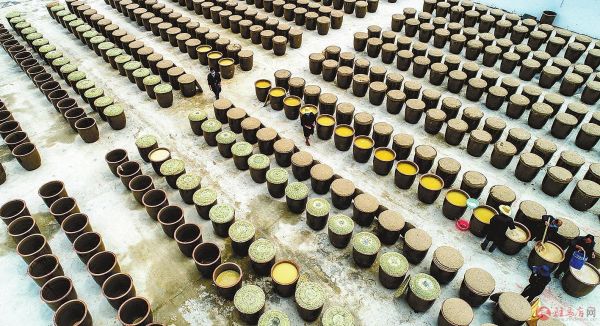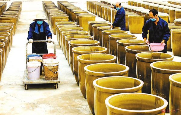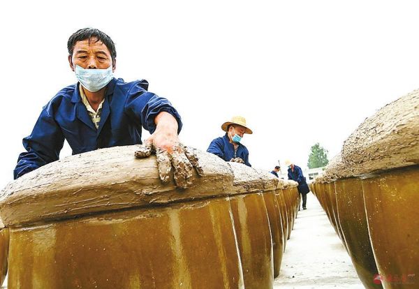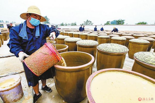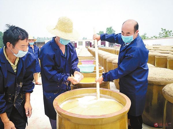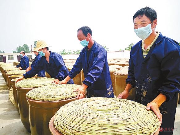 入伏后,正阳县王勿桥醋业合作社的晒醋场里醋香四溢,工人们正抓紧时间酿制醋原料,进行入缸,测温、验质封缸。这些封缸的醋由56家社员组成。制醋技师们精心制作,传承古法工艺,要在头伏完成选料、制曲、配料后封缸,140天自然发酵后启坛取醋、入窖,封藏3至5年后投入市场。