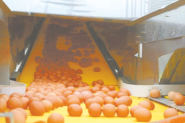 “这里每一栋智能鸡舍都有上下10层,我们通过控制室调节鸡舍内部的温度、湿度、光照风速,敲敲键盘就能给蛋鸡喂水喂料,产出的鸡蛋会自动滑到拣蛋传送带上,由传送带运到我们的分拣包装车间。”吴朝利介绍,有了智能化的设施设备,时间缩短了不少,原来拣蛋靠人力,现在鸡蛋经过传送带时,机器毛刷自动开启,喷水烘干一气呵成,脏蛋、畸形蛋、血蛋等品质不好的鸡蛋会被全部挑出。