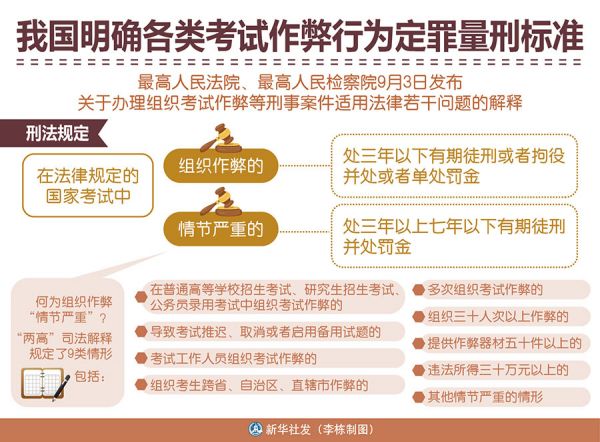新华社北京9月3日电(记者罗沙)考试是人才选拔的重要途径,维护考试公平事关社会公平正义。最高人民法院、最高人民检察院3日发布关于办理组织考试作弊等刑事案件适用法律若干问题的解释,对考试作弊犯罪的定罪量刑标准和有关法律适用问题作出全面系统的规定。