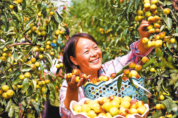 9月26日,在驿城区香山街道扶贫产业基地天中生态园,一颗颗果实饱满的冬枣缀满枝头,散发着诱人的清香,农户正在采摘、装箱、贴标,一派繁忙的丰收景象。